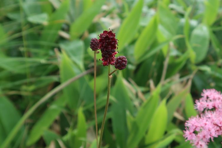 赤紫色が特徴的なバラ科のワレモコウ。花弁がない穂状の集合花。