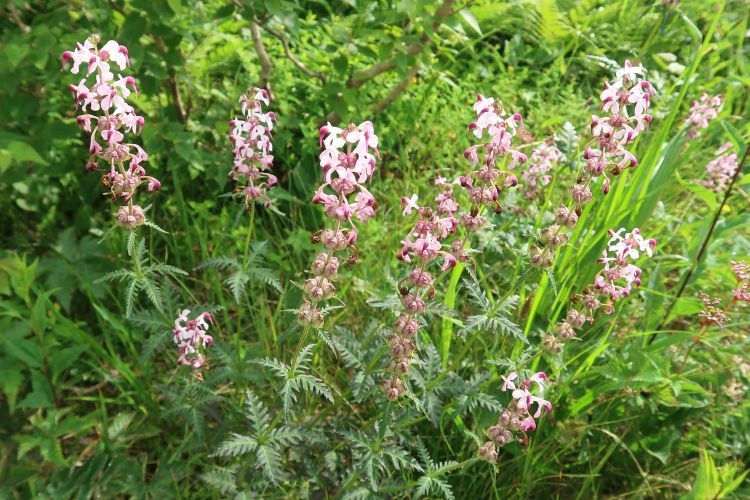淡いピンクと紫の組み合わせは、ハマウツボ科のヨツバシオガマ。