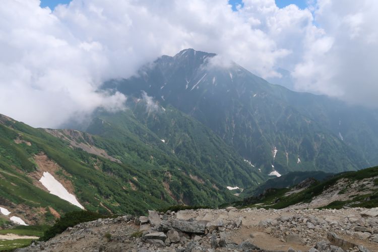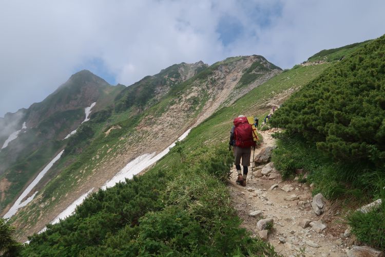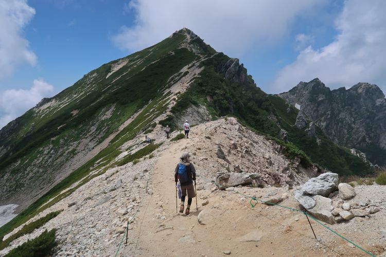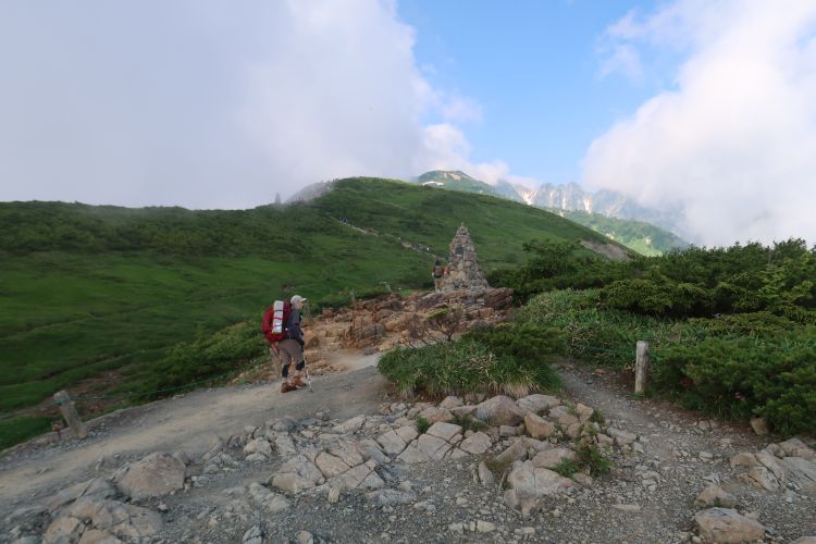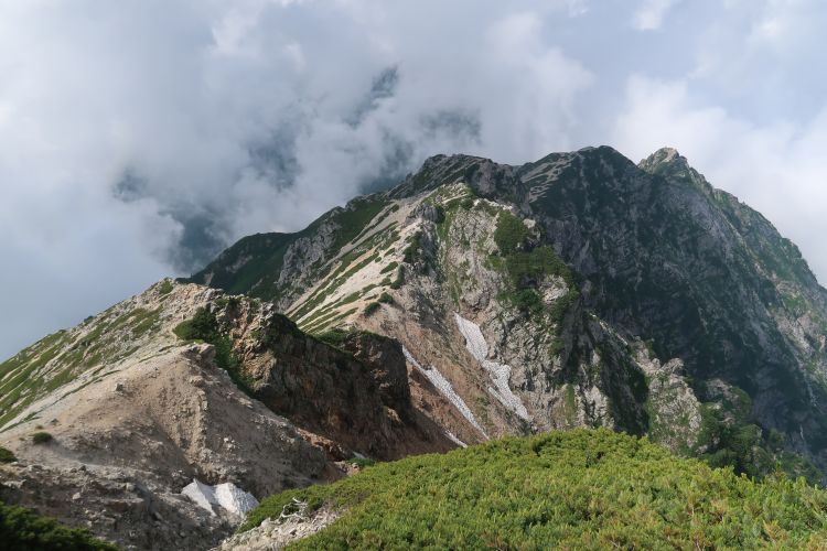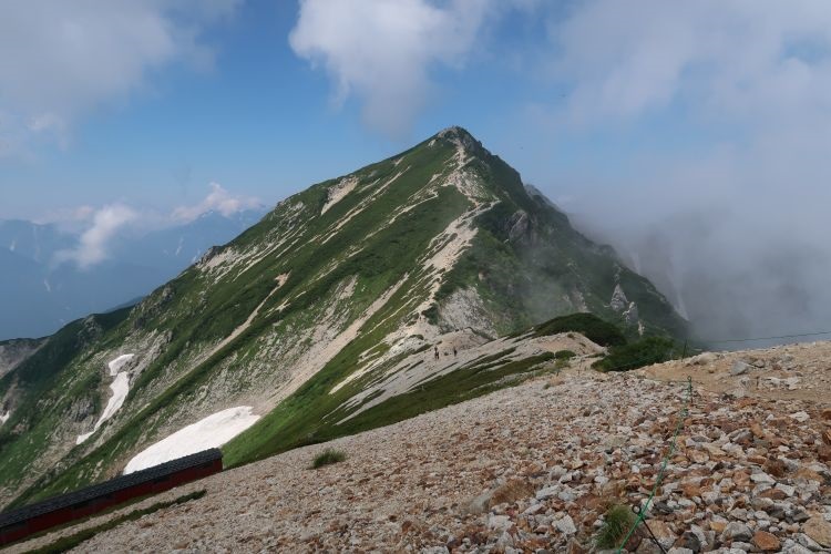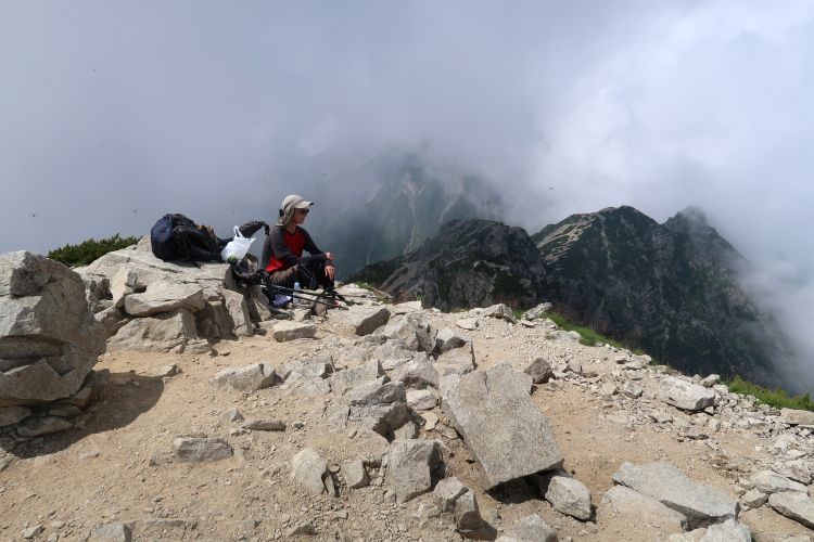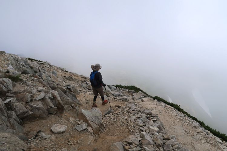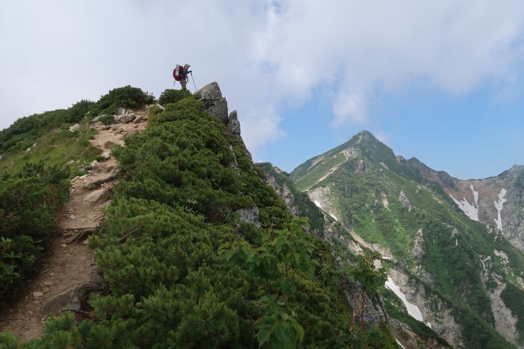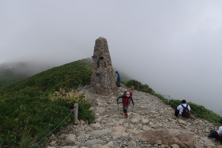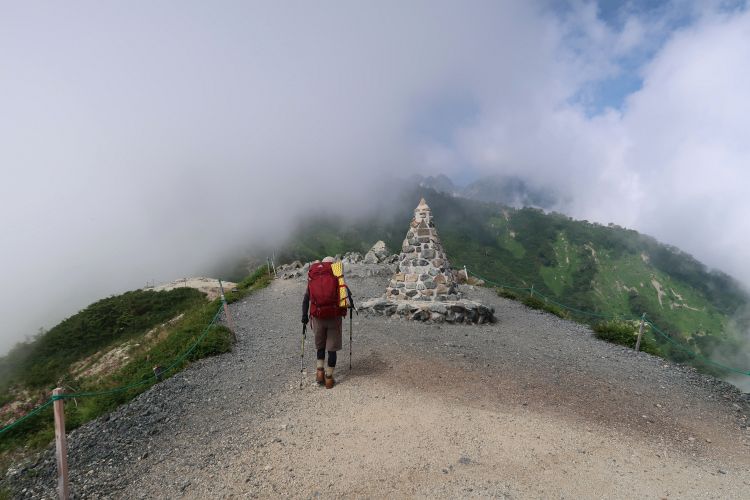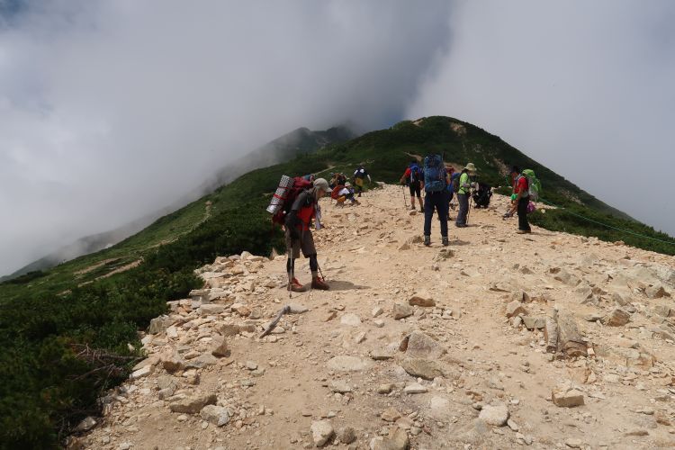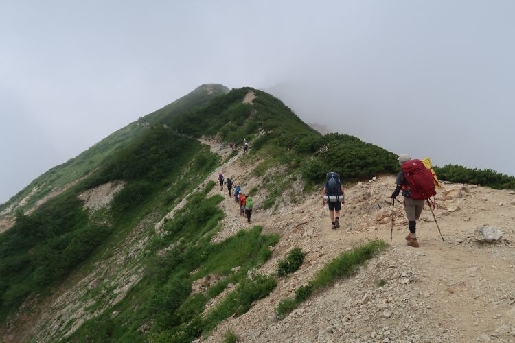 北側には白馬三山が見えるはずだが、ガスに覆われていた。眼下には白馬三山へ続く不帰ノ嶮(かえらずのけん)と呼ばれる険しい稜線。登ってくる登山者が見えていた。