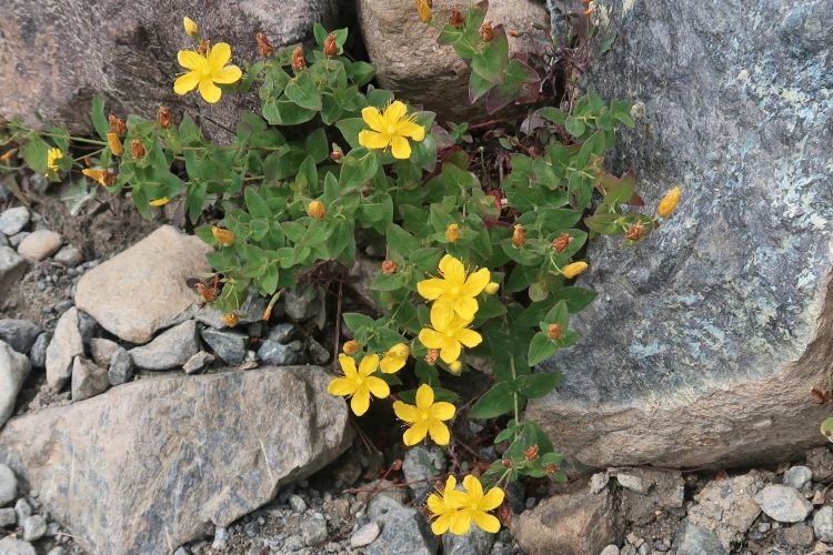オトギリソウ科のシナノオトギリ。本種の葉の黒点は縁にだけあって葉面には明点があるが、よく似たイワオトギリの場合は、黒点が縁にはあまり無くて葉裏全体に散らばり、明点はほとんどない。