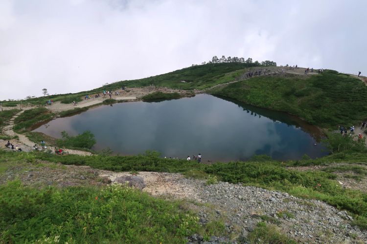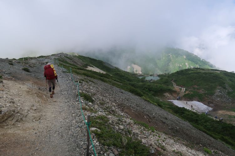 八方池が見えてきたが、ガスが出ていたので寄らずに先へ進んだ。八方池まで登って帰る人も多いようだ。