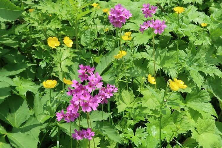 サクラソウ科のオオサクラソウ。当初ユキワリソウだと勘違いしていた。黄色い花はキンポウゲ科のミヤマキンポウゲ。