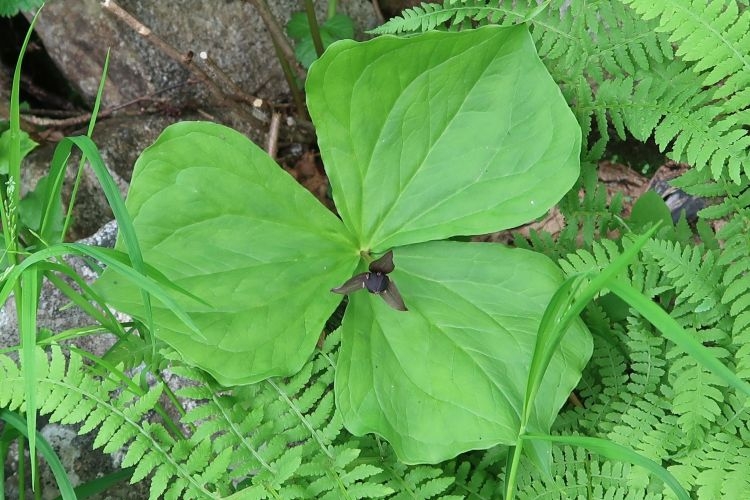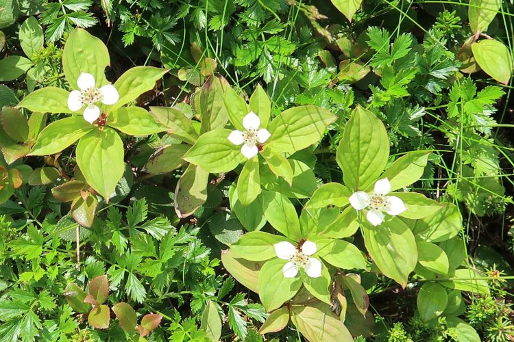 ミズキ科のゴゼンタチバナ。名前は白山の「御前峰」に由来しており、葉が6枚にまで成長した株が花を咲かせる。
