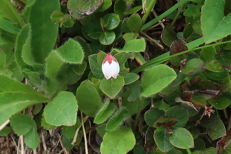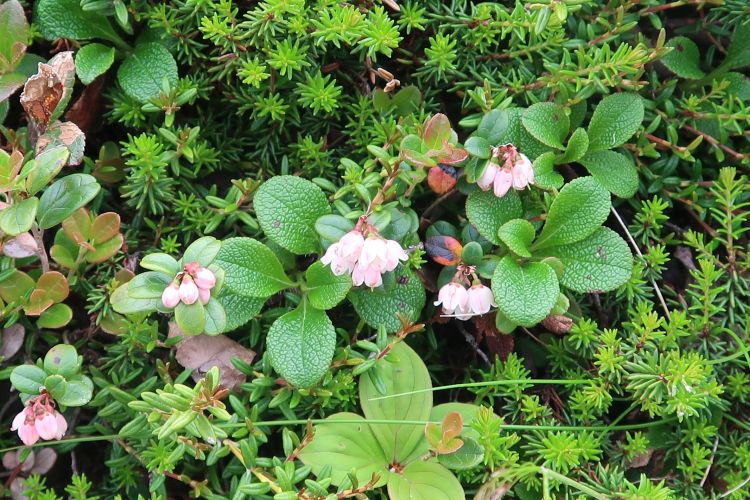 ツツジ科のコケモモ。イワツツジに似るが、コケモモの葉は楕円形で花よりやや大きく、イワツツジの葉は広楕円形で花よりずっと大きい。