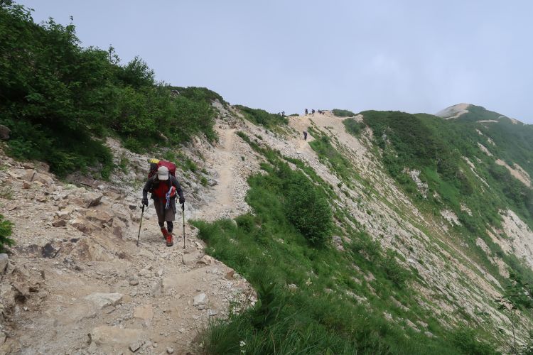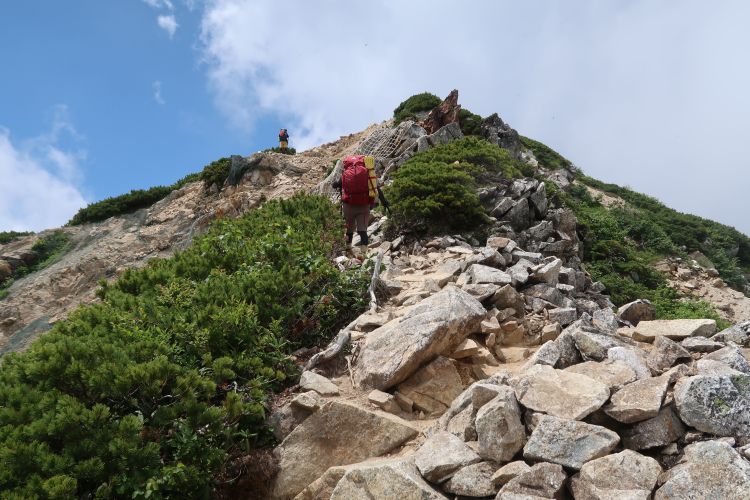 崩落気味の岩尾根を上る。ザックの重みに肩がつらくなり始めていたので、この辺りは非常にキツかった。