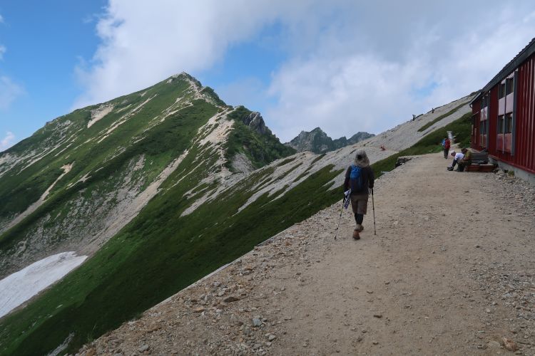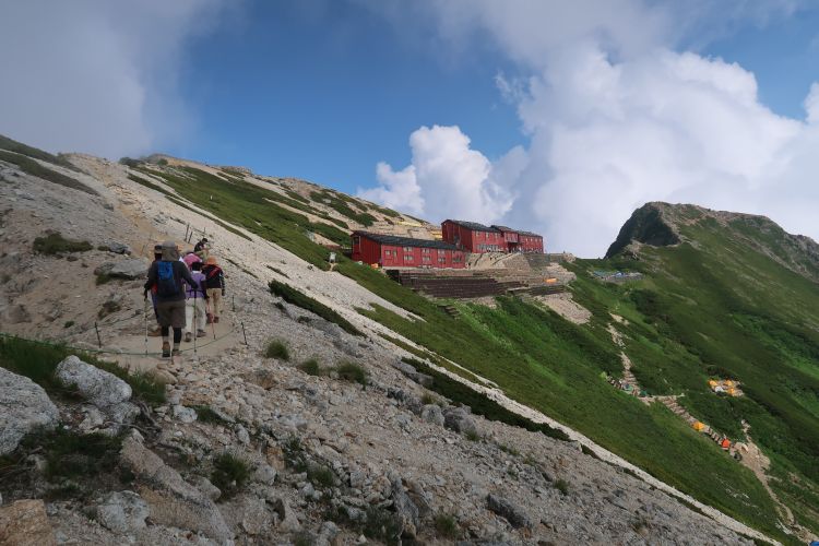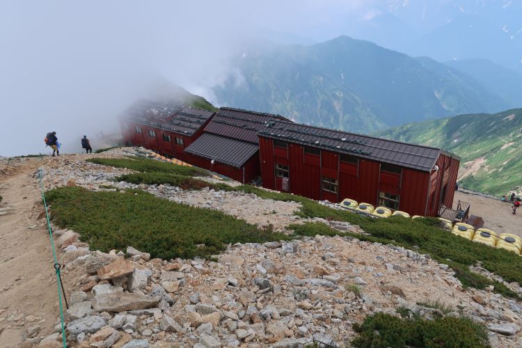 眼下の唐松岳頂上山荘へ下る。登山道から山荘はまったく見えなかったので、いきなり目的地に着いた感じで嬉しかった。