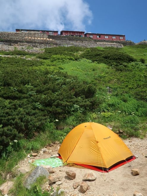 12:20 山荘に到着。テント場利用の手続きは嫁に任せて、私は場所取りのためにすぐ下のテント場へ急いだ。