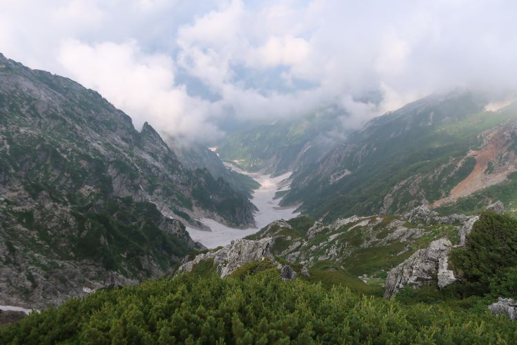 南側には明日登る五竜岳。ガスに覆われて見え隠れしていた。