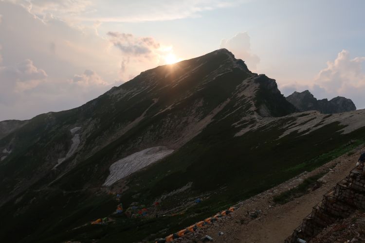 西日が強烈でテントの中は北アルプスの稜線とは思えない暑さだったが、18時半頃、唐松岳の向こうに日が沈むと涼しくなった。明日の五竜岳登山に備えて19時には就寝。夜は雨が降っていたが、寝袋がいらないくらい暖かかった。