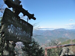 妙法ヶ岳山頂。三峰山神社奥宮前で記念撮影。