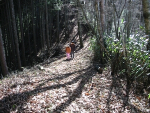 左右が切り立った尾根道を進む。変化に富む山道には、丸太の階段、下が崖の板橋、くさり場、急な石段などがあり、危険はそれほどないものの、適度なスリルがあった。