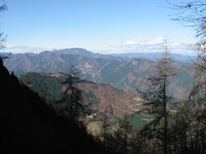 中央やや下に三峰駐車場が見える。こうして見るとかなり遠い。その横、中央右端には、これから登る妙法ヶ岳が見える。
