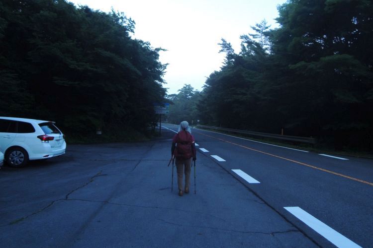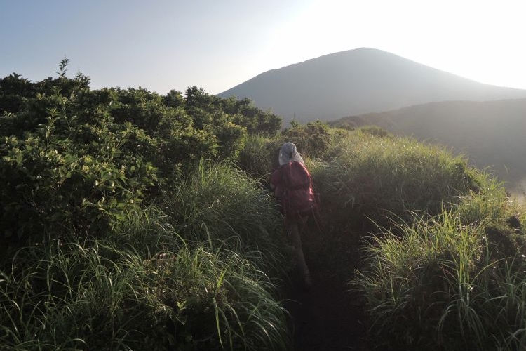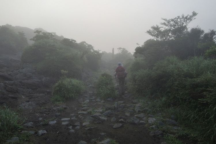朝靄の中、往路は西回りコースを進んだ。反対側の韓国岳避難小屋までは1.7km。