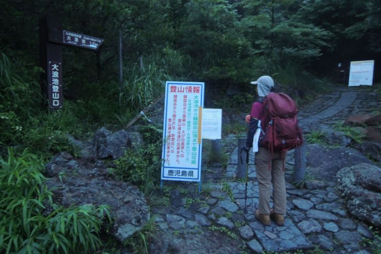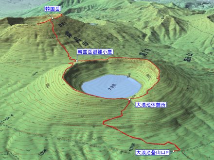 大浪池登山口P 5:25 ⇒ 大浪池休憩所 6:10 ⇒ 韓国岳避難小屋 7:20 ⇒ 8:20 韓国岳 9:15 ⇒ 韓国岳避難小屋 10:00 ⇒ 11:15 大浪池休憩所 11:25 ⇒ 大浪池登山口P 11:55