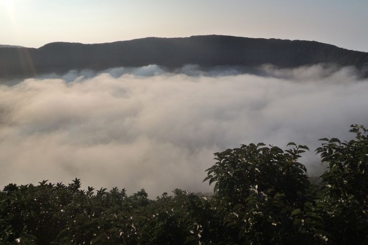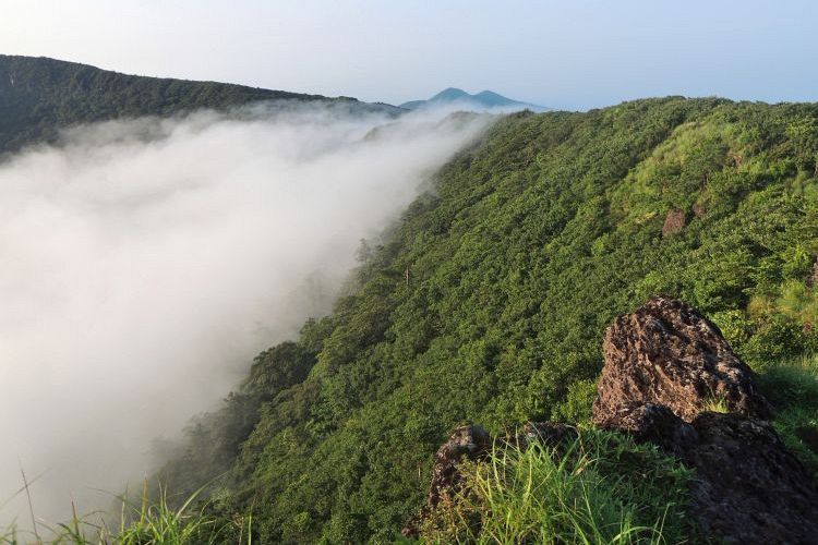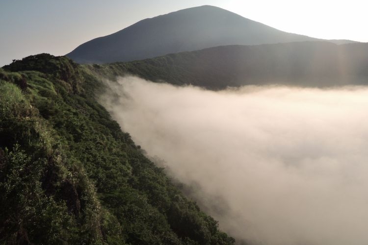 霧島山は大小20以上の火山群の総称で、宮崎県と鹿児島県の県境に位置する。周辺には盆地が広がっており、霧が発生しやすい。山の上部が霧の上に浮かび、島のように見えることから霧島と呼ばれるようになったと云う。