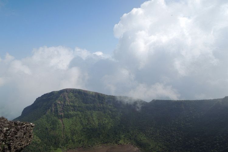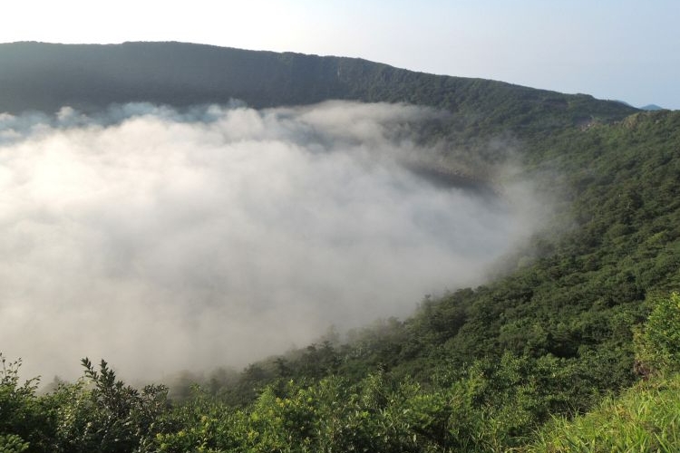 火口縁の最低鞍部である大浪池休憩所あたりに霧が這い上がって、火口の外へ流れ出ていく。