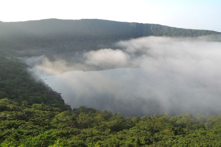 所々で樹林が切れていたり、火口縁の端まで出られる場所があり、火口池を眺めることができた。