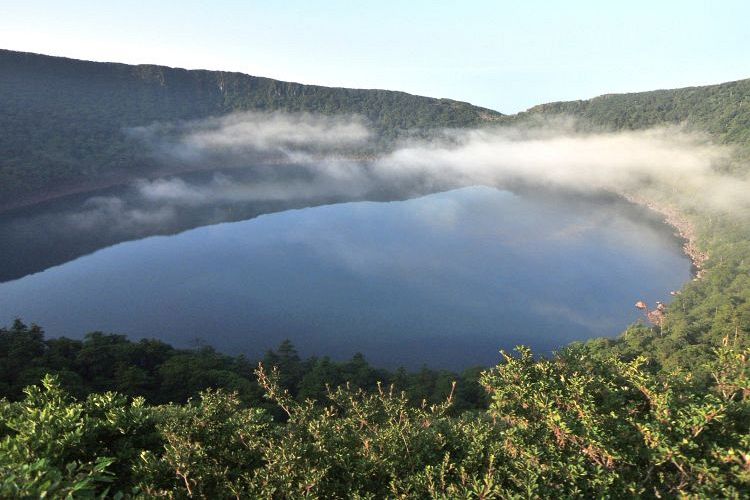 そのうち霧がきれいに晴れて、鏡面のような大浪池の全景が見えた。ちなみに火口の直径は約1kmで、池の直径は630m。
