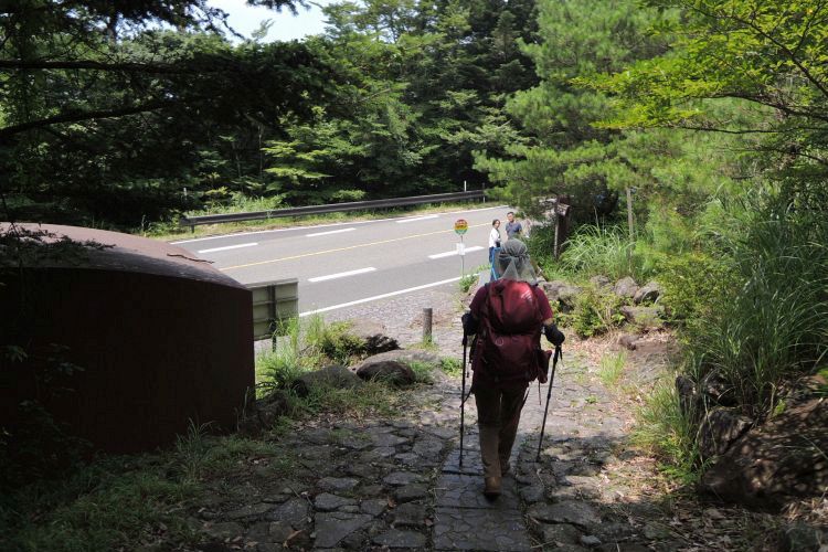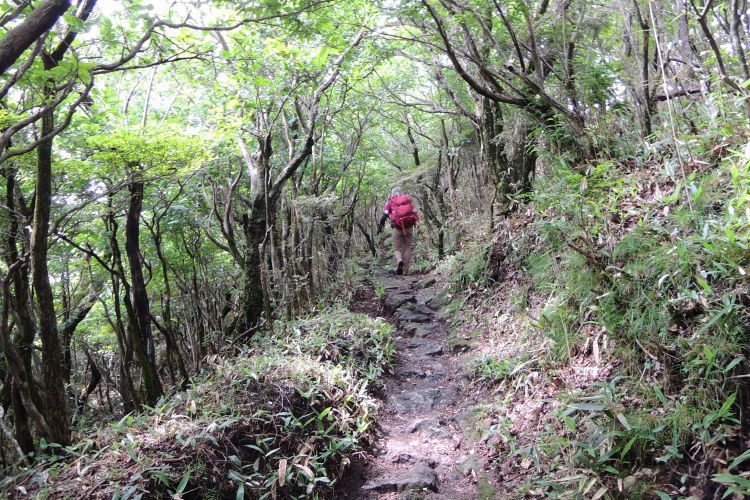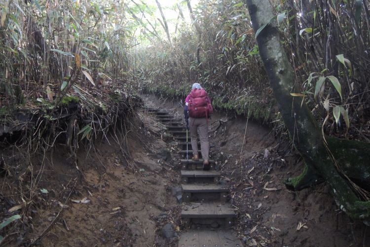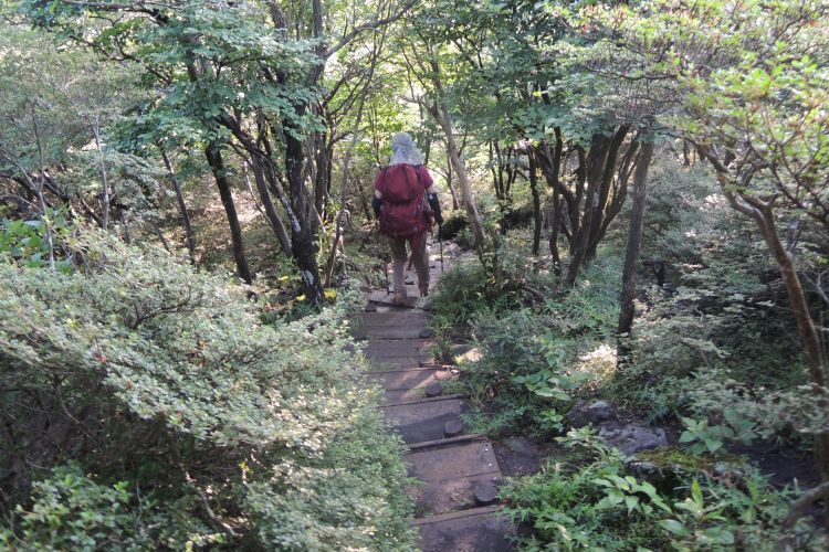 樹林帯に入ってすぐの木段はかなり急なので慎重に下る。上ってくるハイカーと何度もすれ違った。