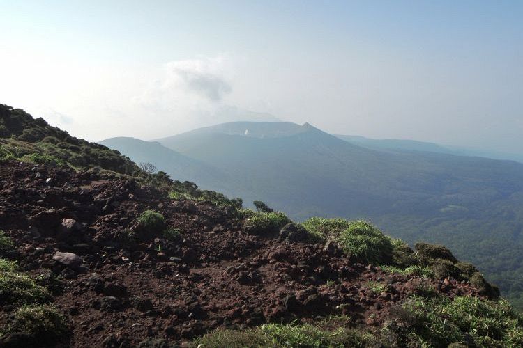 南東側には新燃岳(しんもえだけ)が見えた。2011年1月、1959年以来52年ぶりに爆発的噴火。2012年7月に噴火警戒レベルが緩和されて、韓国岳など一部の登山が可能となったが、いまだに新燃岳には登れない。