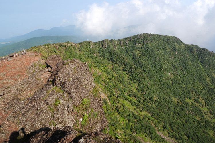 東回りコースも基本的に樹林帯で、コースの途中に展望のきく火口縁の端に出られる場所がある。