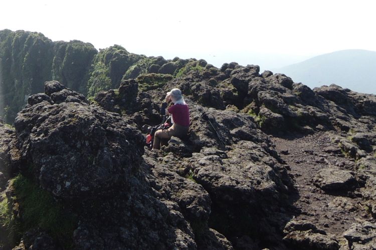 山頂直下の岩場を上る。韓国岳の火口縁で数組の団体登山者がくつろいでいた。