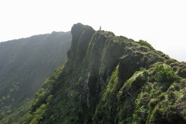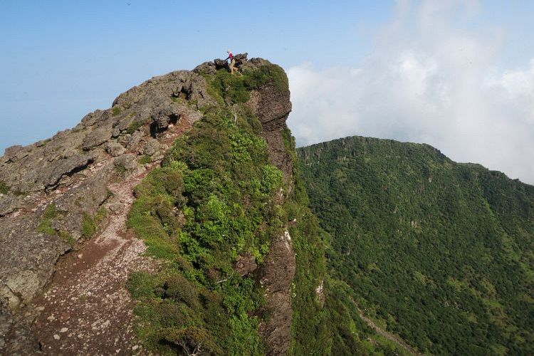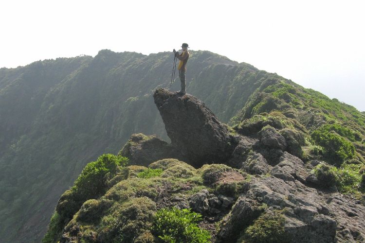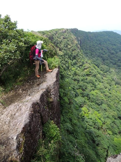 火口縁は断崖絶壁。火口に降りるルートがどこかにあるはずだが、暑さもあって降りる気力は湧かなかった。