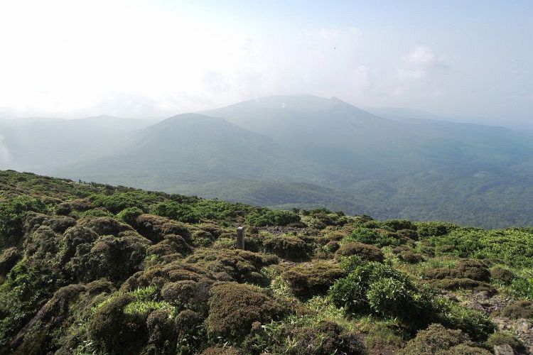 韓国岳の背後に雲が広がりつつあり、山頂部は霧で見えたり見えなかったりしていた。