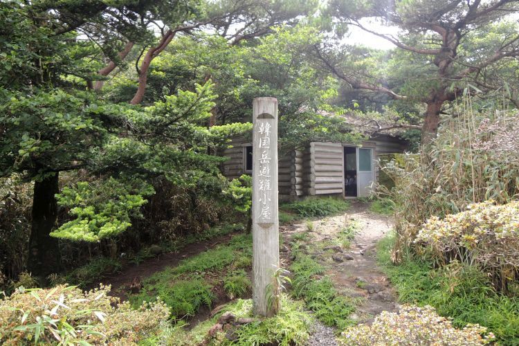 10:00 韓国岳避難小屋の分岐に到着。小屋の中からにぎやかな話声がきこえていた。
