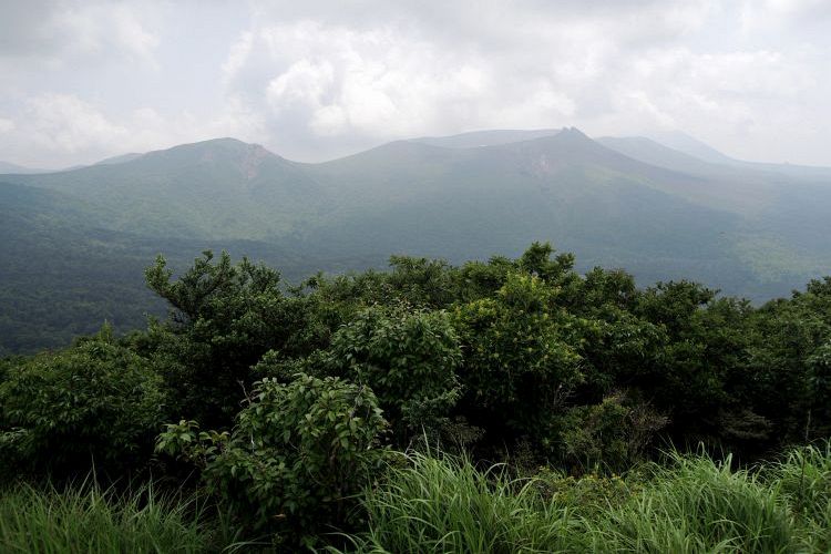 東側の獅子戸岳と新燃岳。右奥に見えるはずの高千穂峰は雲の中だった。