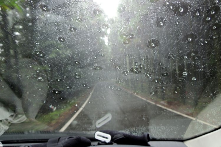 13:00 えびの高原を過ぎたあたりで猛烈な雨に見舞われた。山側から流れる雨水で道路が川のようになっていた。