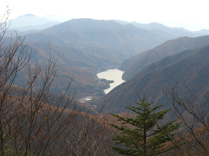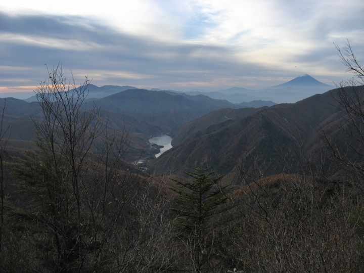 広瀬湖の左上に倉掛山、その奥には大菩薩嶺、金沢山、黒岳、大蔵高丸とハマイバ丸、大谷ヶ丸と並び、右上には三ツ峠山が幽かに見える。