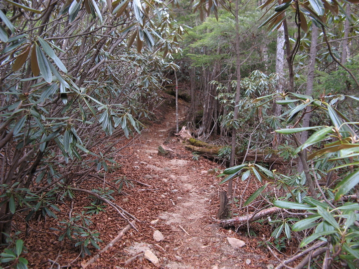体調とペース配分を考えながら先を急ぐ。背丈を超えるシャクナゲのトンネルは、葉についた小さな羽虫が落ちてくるのが嫌だった。