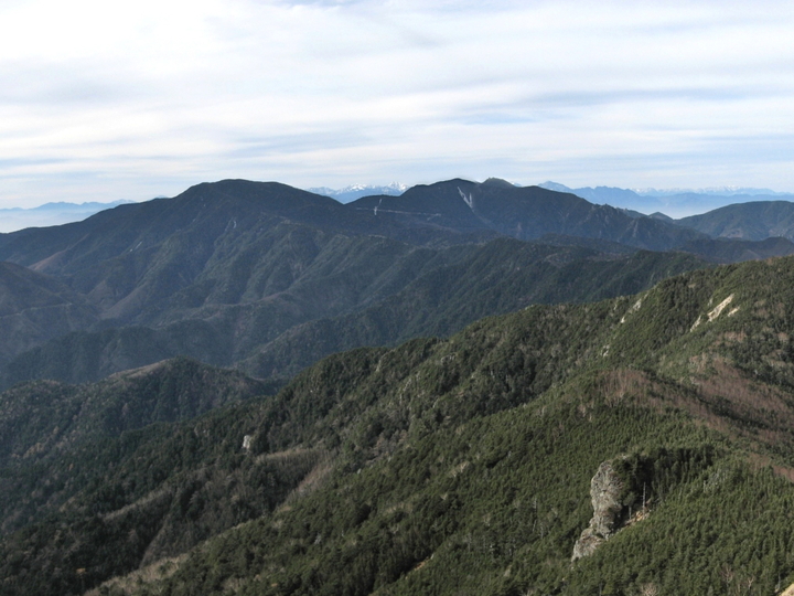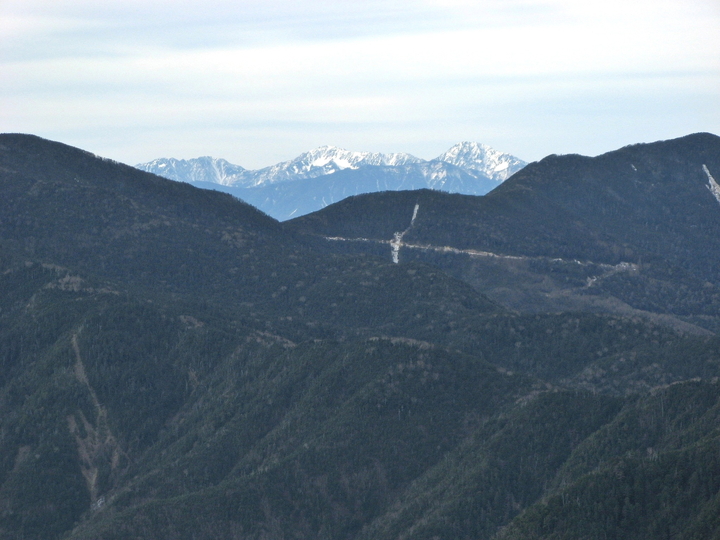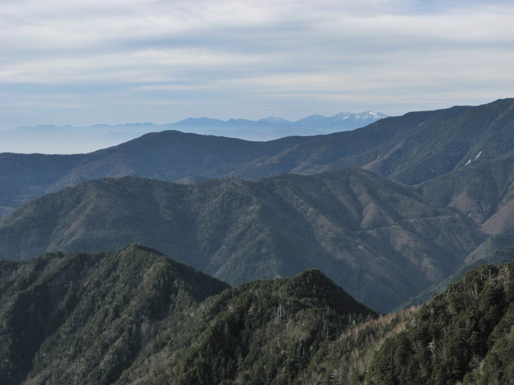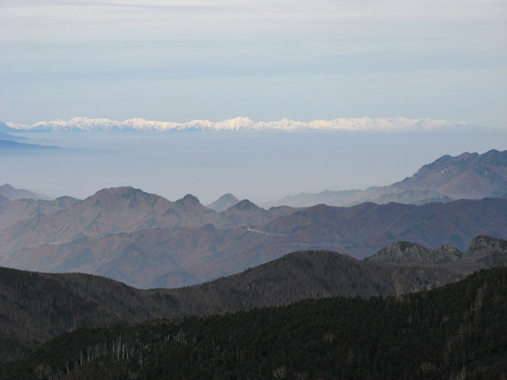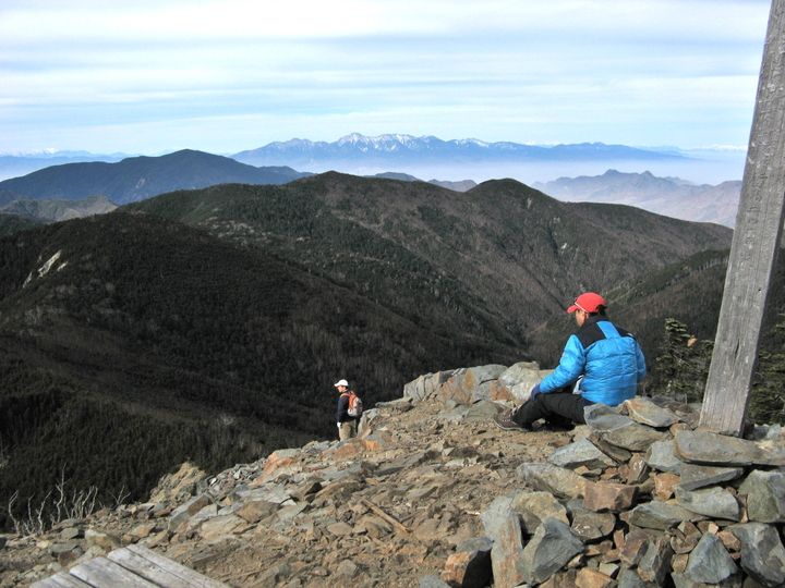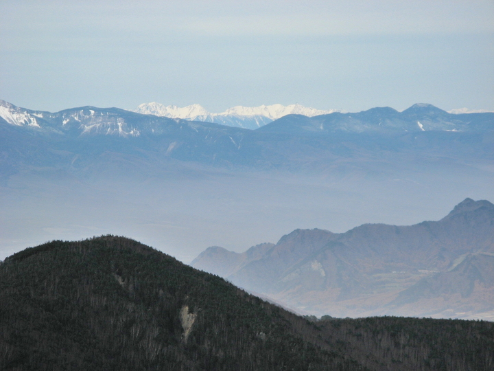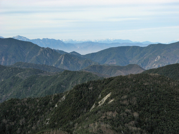 南西側には左から布引山、笊ヶ岳(ざるがたけ)、上河内岳、聖岳、赤石岳、悪沢岳と続く南アルプスが見えていた。