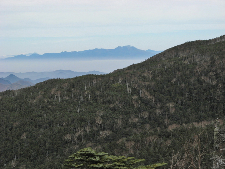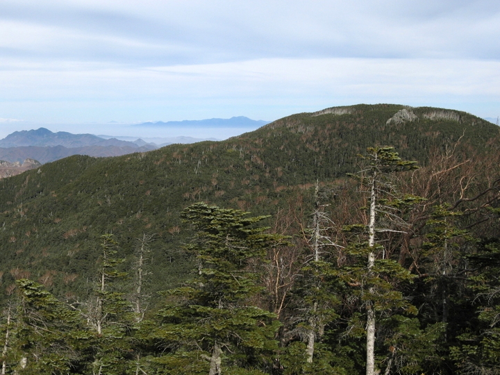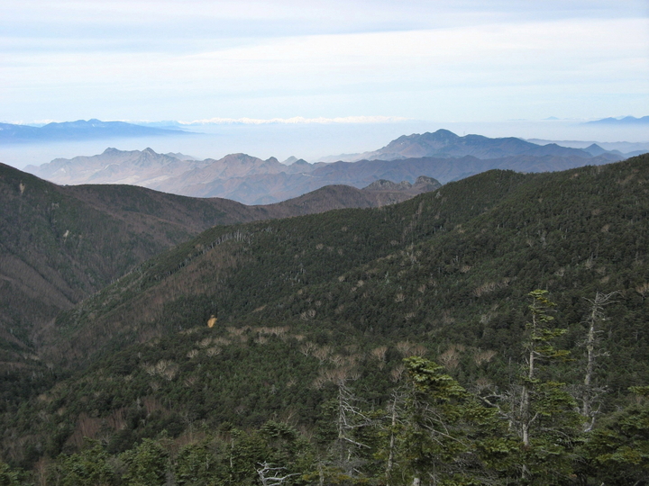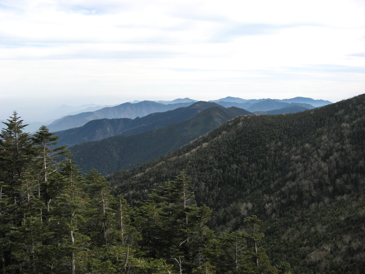 ゼイゼイいいながら眺めのよい露岩に出た。曇り空が気になっていたが、思いのほか遠望はきいた。