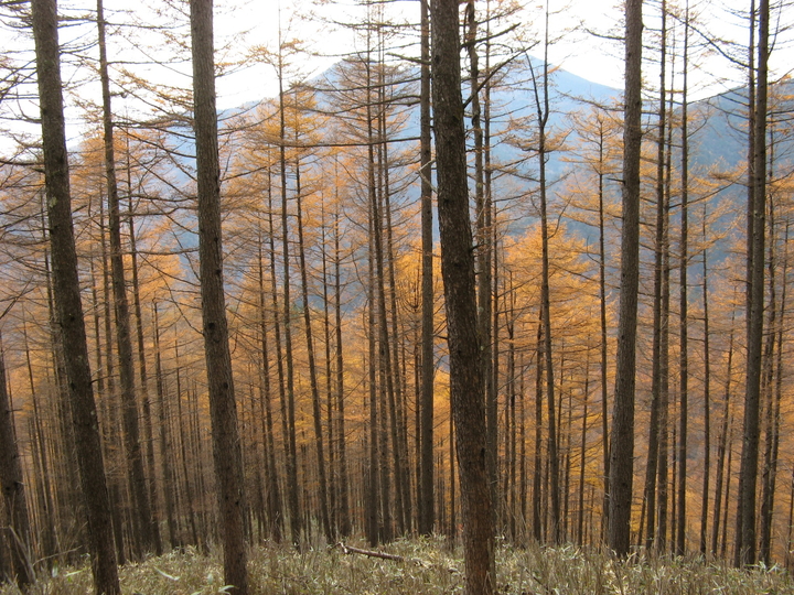 西側の黄葉した唐松の樹間から、鶏冠山の山頂部が見えた。