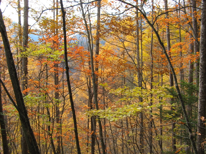 傾斜のきついツガの原生林を上る。