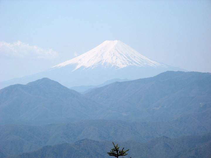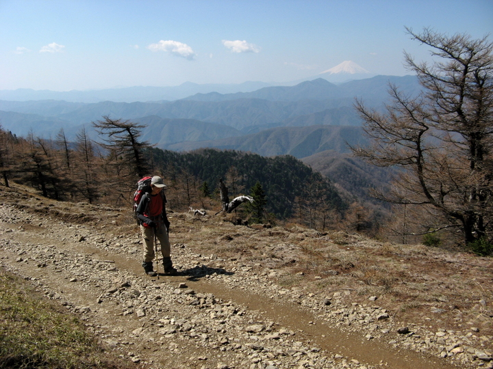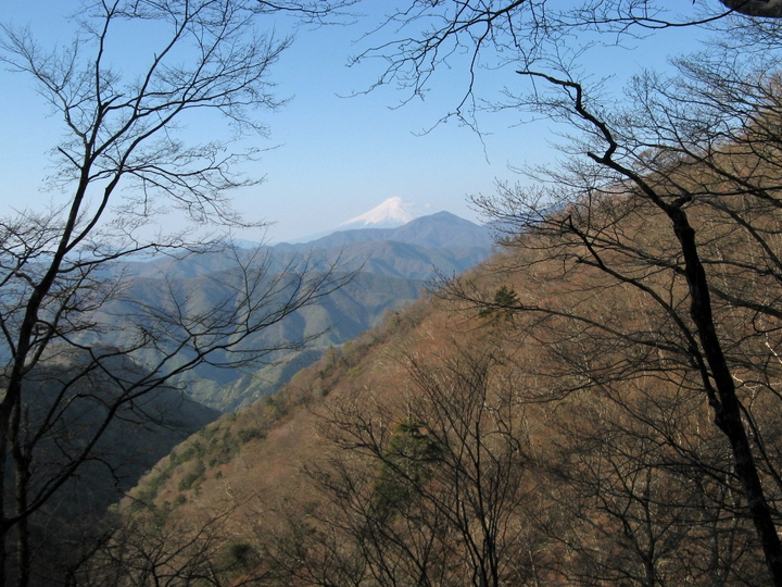 道が尾根の東側から西側へ移ってしばらく進むと樹間に富士山が見えた。