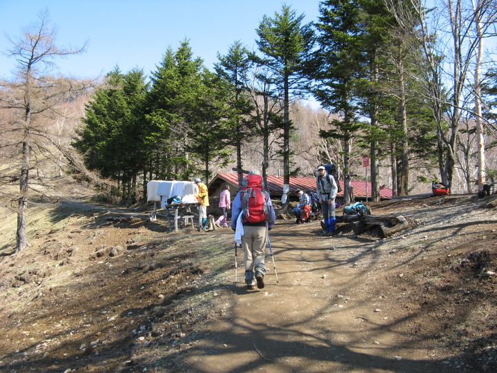 8:20 奥多摩小屋に到着。本来の指定幕営地はここ。多くのハイカーが小屋の周辺で休んでいた。