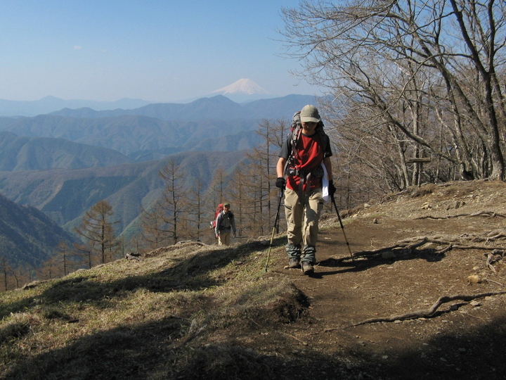 富士山を前方にのぞみながら、小雲取山の急坂を下る。