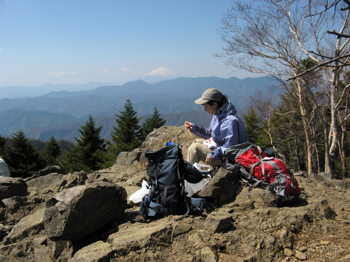 眺めのよい山梨側の山頂に戻り、岩場でのんびり食事にした。
