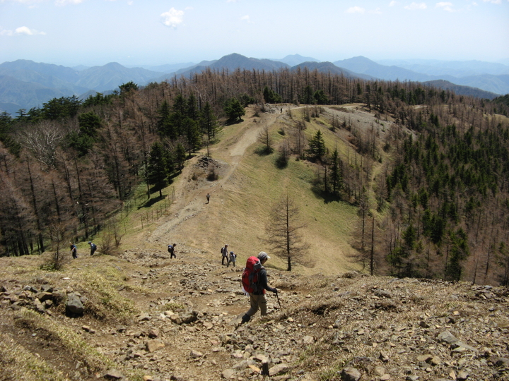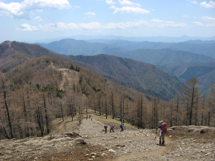 ヨモギノ頭からの下りも眺めが素晴らしい。ヘリポートから七ツ石山までの石尾根縦走路が一望できる。七ツ石山の右には三頭山、さらにその右奥には丹沢山と蛭ヶ岳がうっすら見えていた。