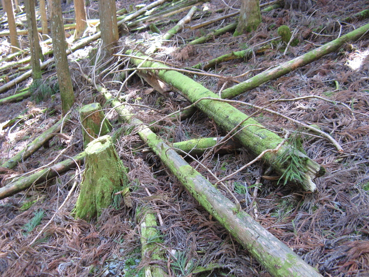 間伐材に緑の苔が生えていた。陽光が当たって蛍光塗料のように輝いていた。