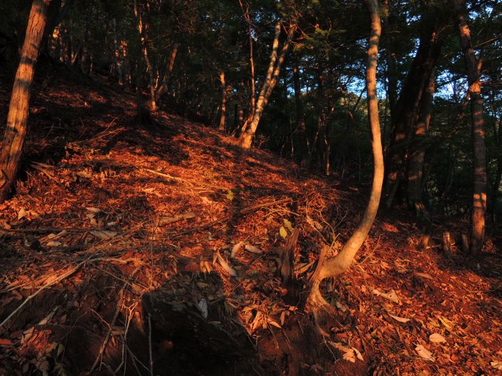落ち葉で埋まった斜面が、朝陽に赤く染まっていた。