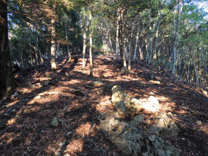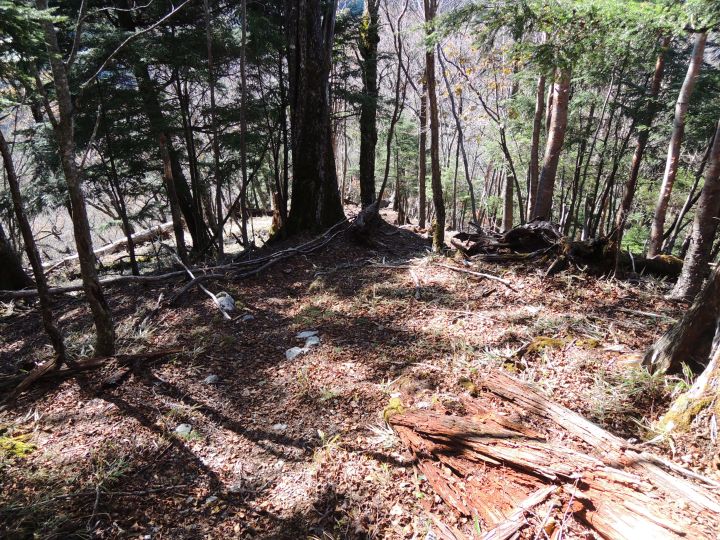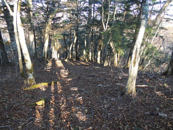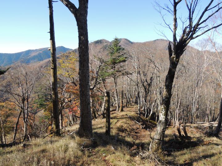 広い尾根の下り。踏み跡が不明瞭で赤テープも見当たらず、また道をロストしかかるが、先を行くハイカーが右下に見えてルートに戻れた。