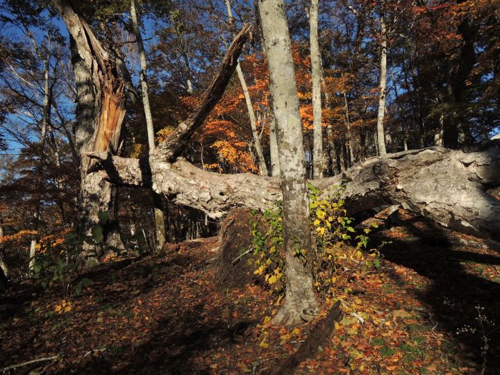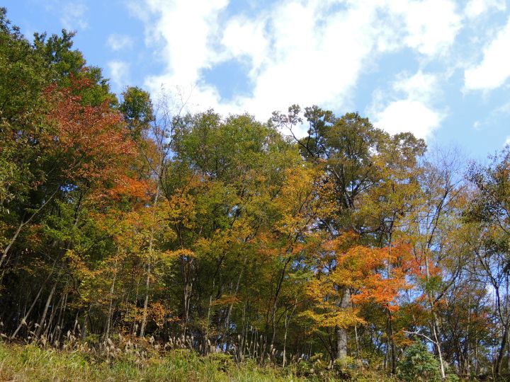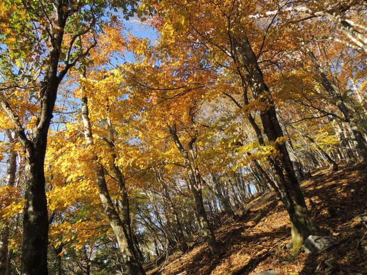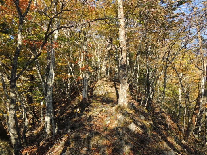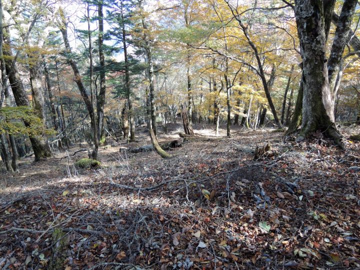 紅葉を楽しみながら尾根筋をまっすぐ上り返すが、そのうち赤テープが全然見当たらないことに気づいた。それでも道は続いてるように見えるので、そのまま進むと小ピークに出てしまった。不安を覚えつつ、すぐさま地図を確認。ピークの東側を巻いて進むところを直登してしまったと判断。西側に降りてそのまま長沢山へ向かえば近いとも考えたが、東側に降りた方が確実だと思い直す。コンパスを見て東側斜面を下る。このまま下れば必ず元のルートに当たるはずだと思いながら進むが、時間を無駄にした焦りと不安で気が気じゃなかった。