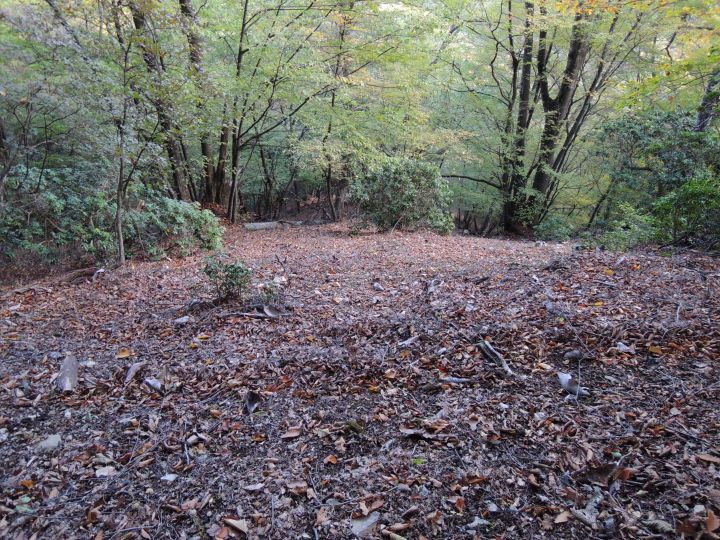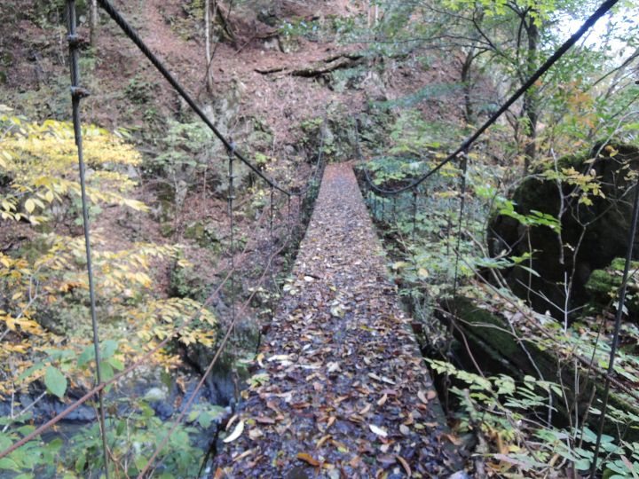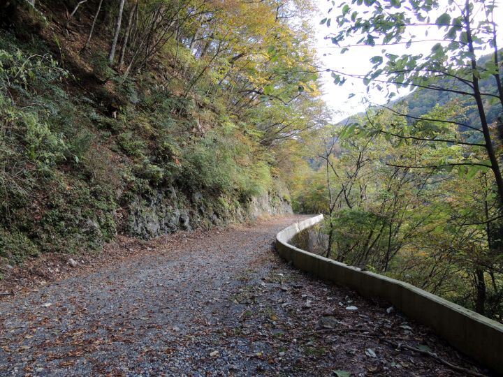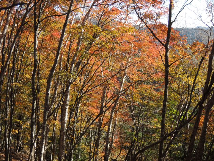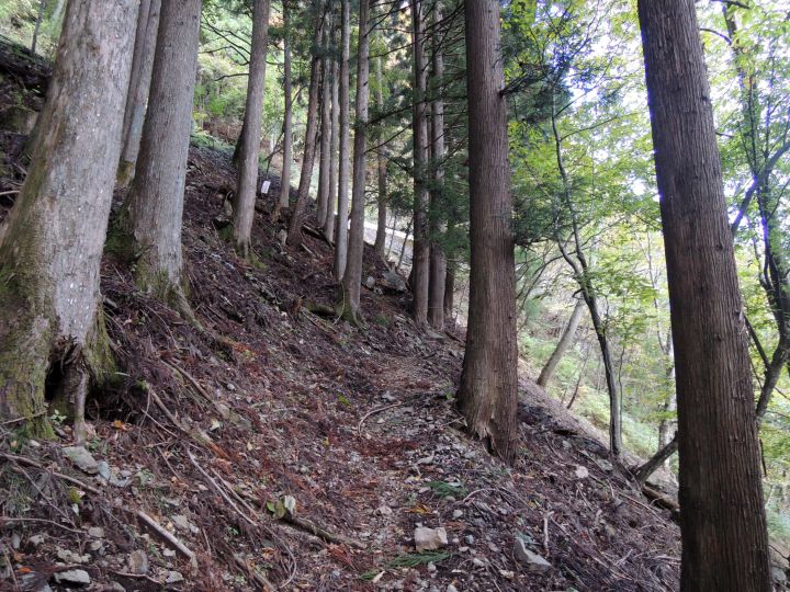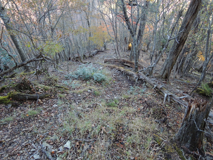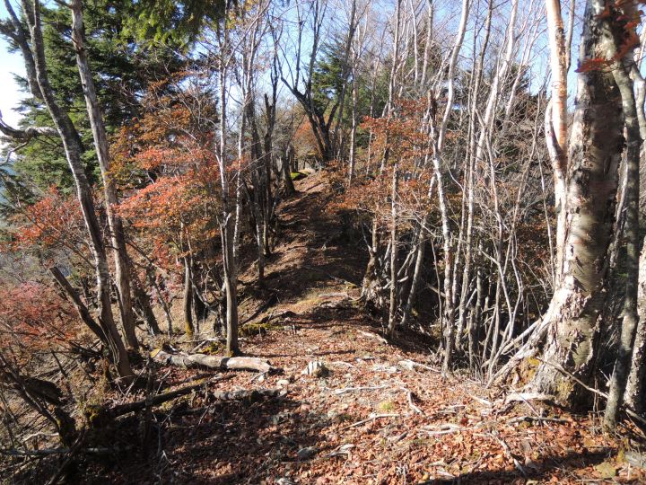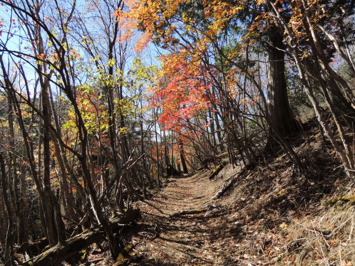 紅葉の後は九十九折の急下降。落ち葉でルートが分かりづらく、崩落気味の場所もあった。
