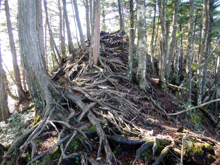 木の根がむき出しになった尾根。途中、右の大腿四頭筋が何度か攣りそうになり、ペースを落とした。