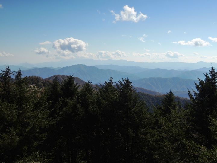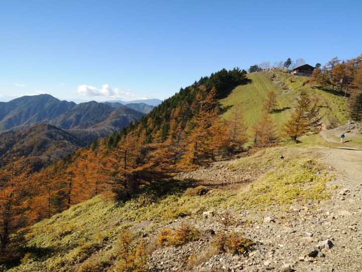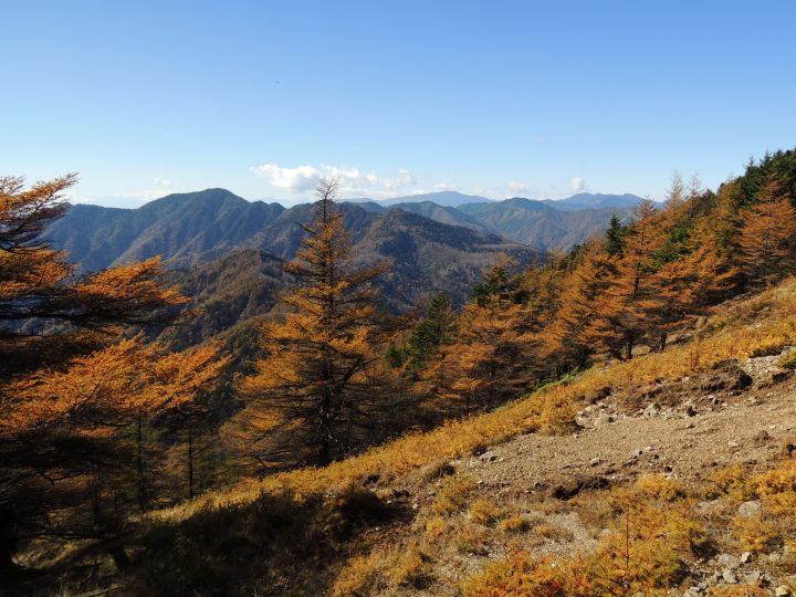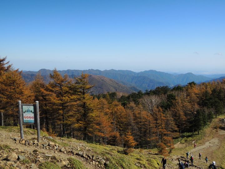 山頂の下はカラマツ林が綺麗に黄葉していた。左の大洞山(飛龍山)の上に南アルプスの山並みが幽かに見えていた。