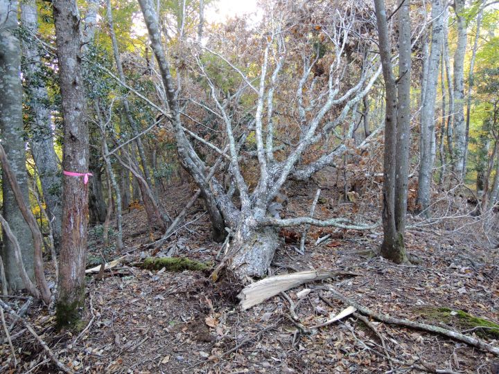 完全にルートを隠していた倒木。越えると赤テープがあったが、下りも踏み跡が少なくて難儀した。